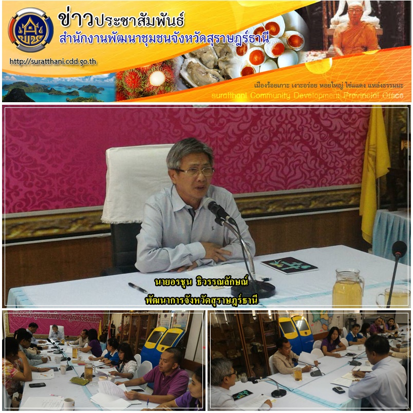 วันนี้ 11 มี.ค.59 เวลา 14.00 น. นายอรชุน ธิวรรณลักษณ์ พัฒนาการจังหวัดสุราษฎร์ธานี เป็นประธานการประชุมคณะทำงานตามโครงการพัฒนาชุมชนใสสะอาด ประจำปีงบประมาณ 2559 สำนักงานพัฒนาชุมชนจังหวัดสุราษฎร์ธานี ทั้งนี้เพื่อกำหนดแนวทางการดำเนินงานโครงการฯ ในการส่งเสริมให้หน่วยงานในสังกัดมีการบริหารราชการด้วยความโปร่งใส ตลอดจนเป็นการส่งเสริมให้ข้าราชการปฏิบัติหน้าที่ราชการด้วยความซื่อสัตย์สุจริต ณ ห้องประชุมสำนักงานพัฒนาชุมชนจังหวัดสุราษฎร์ธานี