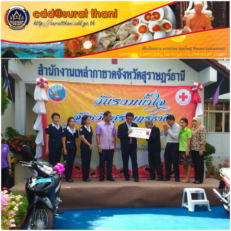 16 มี.ค.59 เวลา 11.30 น. นายอรชุน ธิวรรณลักษณ์ พัฒนาการจังหวัดสุราษฎร์ธานี ส่งมอบของรางวัลในนามสำนักงานพัฒนาชุมชนจังหวัด เพื่อร่วมกิจกรรมงานกาชาดจังหวัดสุราษฎร์ธานี โดยนายวงศศิริ พรหมชนะ ผู้ว่าราชการจังหวัดสุราษฎร์ธานี รับมอบของรางวัล ณ สำนักงานเหล่ากาชาดจังหวัดสุราษฎร์ธานี