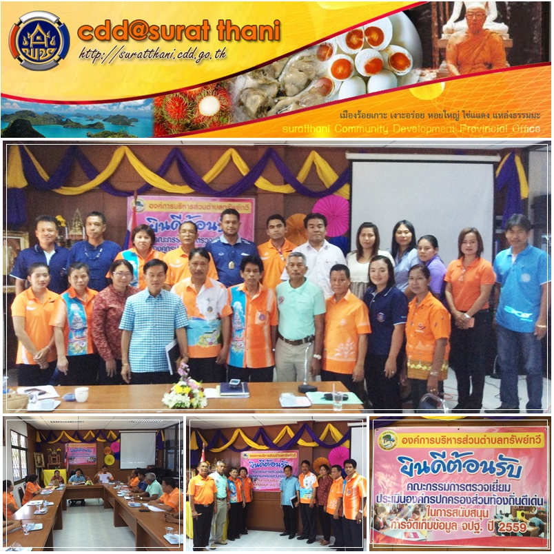 วันนี้ 7 เม.ย.59 นายไพศิษฎ์ อินทรโยธา หัวหน้ากลุ่มงานสารสนเทศฯ นำทีมคณะกรรมการตรวจเยี่ยมประเมินองค์กรปกครองส่วนท้องถิ่นดีเด่น ประจำปี 2559 เข้าประเมินและตรวจเยี่ยม ณ องค์การบริหารส่วนตำบลทรัพย์ทวี ในการสนับสนุนการจัดเก็บข้อมูล จปฐ. ปี 2559 โดยนายธนวัฒน์ รอดจิตต์ นายอำเภอบ้านนาเดิม พร้อมด้วยนายก อบต. กำนัน/ผู้ใหญ่บ้าน ให้การต้อนรับ ณ ห้องประชุมองค์การบริหารส่วนตำบลทรัพย์ทวี อำเภอบ้านนาเดิม จังหวัดสุราษฎร์ธานี
