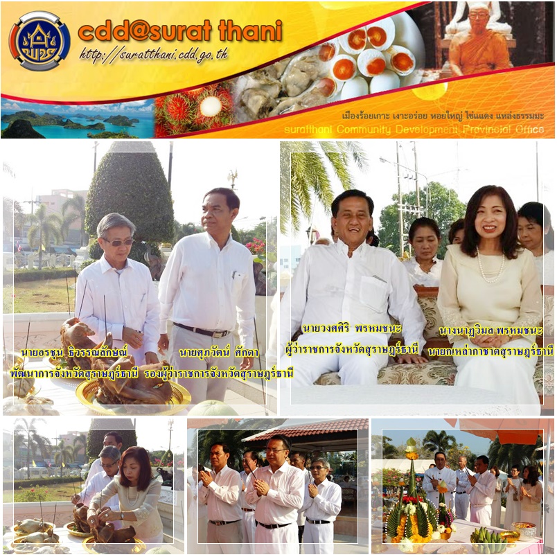 วันนี้ 11 เมษายน 2559 เวลา 08.00 น. นายอรชุน ธิวรรณลักษณ์ พัฒนาการจังหวัดสุราษฎร์ธานี ร่วมพิธีบวงสรวงศาลหลักเมืองสุราษฎร์ธานี เนื่องในงานสมโภชศาลหลักเมืองและกาชาดสุราษฎร์ธานี ประจำปี 2559 ในระหว่างวันที่ 2-11 เมษายน 2559 โดยนายวงศศิริ พรหมชนะ ผู้ว่าราชการจังหวัดสุราษฎร์ธานี เป็นประธานในพิธี ทั้งนี้ยังมีหัวหน้าส่วนราชการ ข้าราชการ พ่อค้าประชาชน นักเรียน นักศึกษา ร่วมพิธีบวงสรวงเพื่อเป็นศิริมงคลร่วมกัน ณ บริเวณศาลหลักเมืองสุราษฎร์ธานี อำเภอเมืองสุราษฎร์ธานี