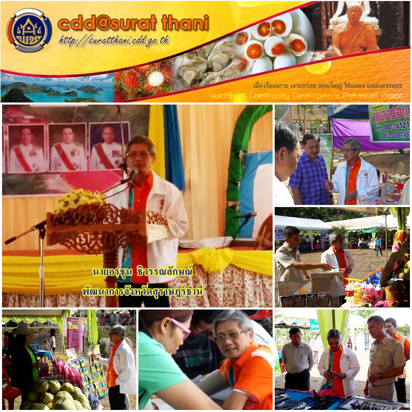 วันนี้ 21 เม.ย. 59 เวลา 09.00 น. นายอรชุน ธิวรรณลักษณ์ พัฒนาการจังหวัดสุราษฎร์ธานี ร่วมโครงการ “หน่วยบำบัดทุกข์ บำรุงสุข สร้างรอยยิ้มให้ประชาชน” กิจกรรมจังหวัดเคลื่อนที่ ณ โรงเรียนไทยรัฐวิทยา 22 หมู่ที่ 3 ตำบลบ้านเสด็จ อำเภอเคียนซา และเยี่ยมชมให้กำลังใจแก่ผู้ประกอบการสินค้าผลิตภัณฑ์ OTOP ของอำเภอและเครือข่าย ภายใต้งาน OTOP ตลาดนัดชุมชน ไทยช่วยไทย คนไทยยิ้มได้สัญจร ครั้งที่ 2 ณ ที่พักสงฆ์บ้านเขาไพรเกศ หมู่ที่ 19 ตำบลบ้านเสด็จ อำเภอเคียนซา จังหวัดสุราษฎร์ธานี