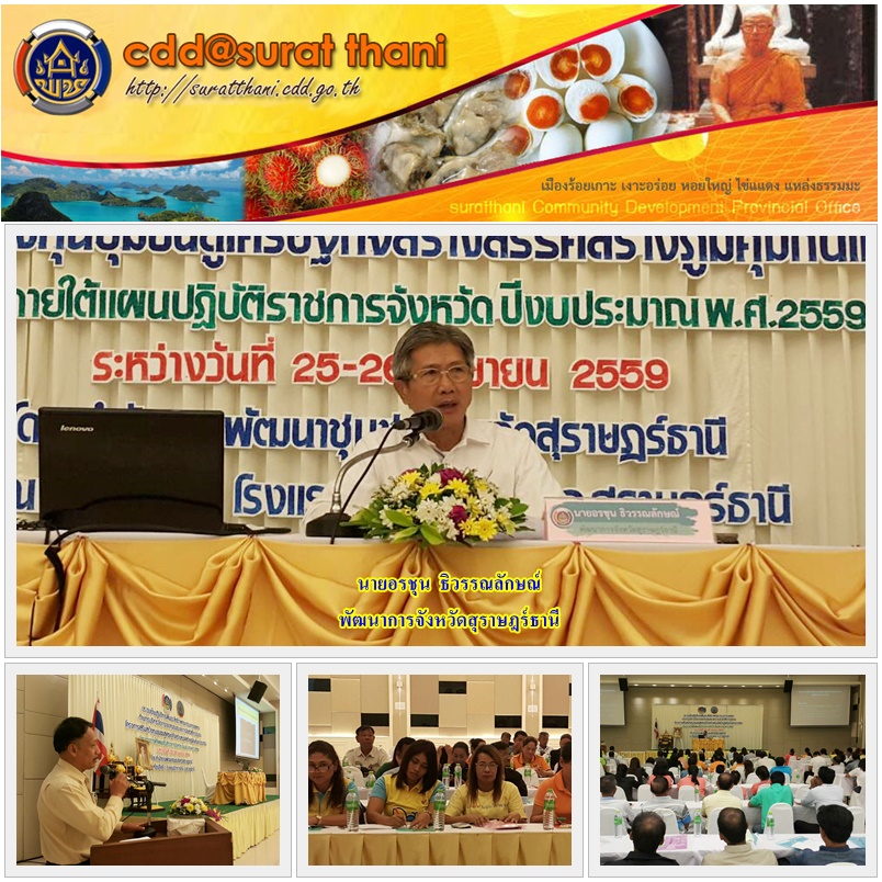 [สุราษฎร์ธานี] วันนี้ 25 เม.ย.59 นายอรชุน. ธิวรรณลักษณ์ พัฒนาการจังหวัดสุราษฎร์ธานี เป็นประธานเปิดการประชุมเชิงปฎิบัติการการเพิ่มประสิทธิภาพคณะกรรมการกองทุน ด้านการบริหารจัดการกองทุนและการจัดสวัสดิการชุมชน เพื่อสร้างความเข้มแข็งของทุนชุมชน ภายใต้โครงการเสริมสร้างทุนชุมชนสู่เศรษฐกิจสร้างสรรค์ภูมิคุ้มกันแก่ประชาชน งบประมาณแผนปฏิบัติราชการจังหวัด ปีงบประมาณ พ.ศ.2559 ระหว่างวันที่ 25-26 เม.ย.59 ณ โรงแรมนิภาการ์เด้น อ.เมืองสุราษฎร์ธานี