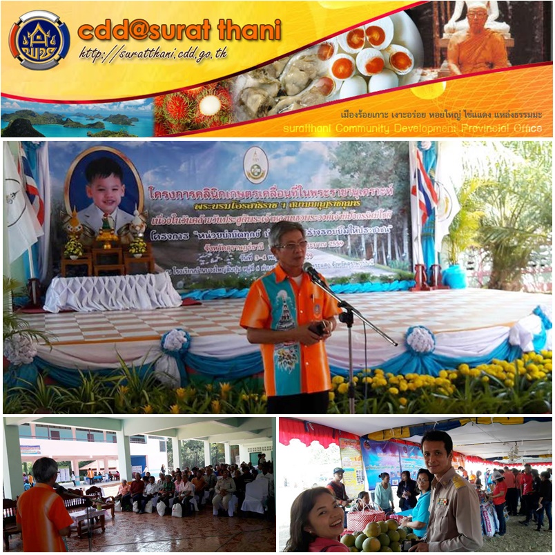 วันนี้ 4 พ.ค. 59 เวลา 09.00 น. นายอรชุน ธิวรรณลักษณ์ พัฒนาการจังหวัดสุราษฎร์ธานี ร่วมโครงการ “หน่วยบำบัดทุกข์ บำรุงสุข สร้างรอยยิ้มให้ประชาชน” กิจกรรมจังหวัดเคลื่อนที่ ภายใต้โครงการคลีนิคเกษตรเคลื่อนที่ในพระราชานุเคราะห์ พระบรมโอรสาธิราชฯ สยามมกุฎราชกุมาร เนื่องในวันคล้ายวัยประสูติพระเจ้าหลานเธอพระองค์เจ้าทีปังกรรัศมีโชติ และเยี่ยมชมให้กำลังใจแก่ผู้ประกอบการสินค้าผลิตภัณฑ์ OTOP ของอำเภอ ณ โรงเรียนบ้านหนองใหญ่สินปุน หมู่ที่ 6 ตำบลสินปุน อำเภอพระแสง จังหวัดสุราษฎร์ธานี
