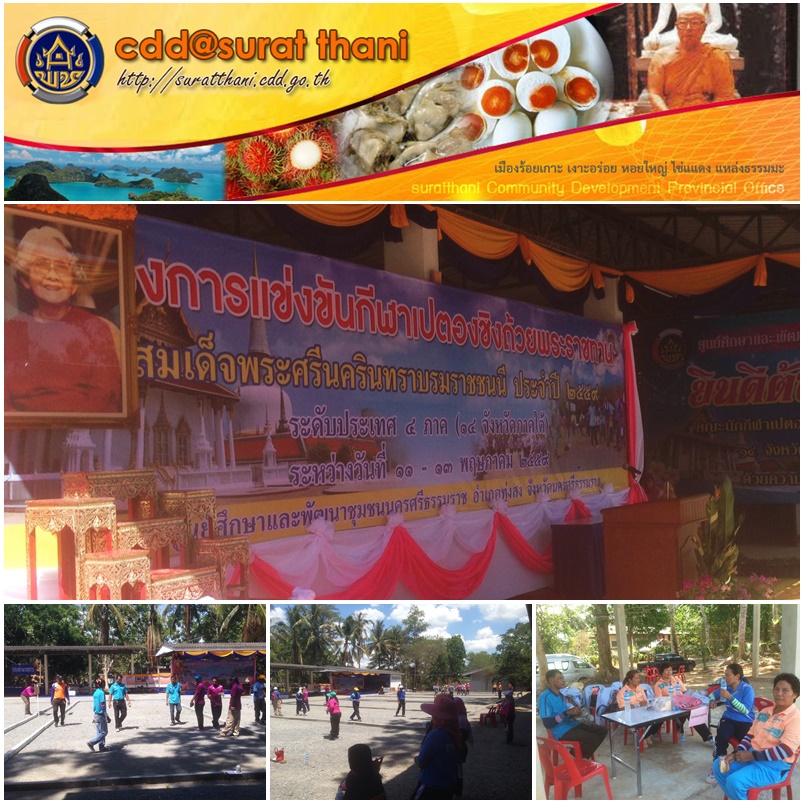 สำนักงานพัฒนาชุมชนจังหวัดสุราษฎร์ธานี นำทีมทัพนักกีฬาเปตองเข้าแข่งขันชิงถ้วยพระราชทานสมเด็จพระศรีนครินทราบรมราชชนนี ประจำปี 2559 ระดับประเทศ 4 ภาค (14 จังหวัดภาคใต้) ซึ่งจะแข่งขันระหว่างวันที่ 11-13 พฤษภาคม 2559 ณ ศูนย์ศึกษาและพัฒนาชุมชนนครศรีธรรมราช
