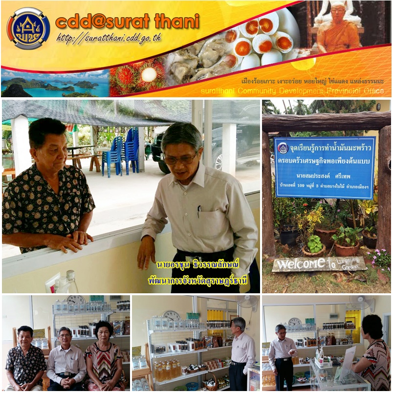 วันนี้ 24 พ.ค.59 เวลา 11.00 น. นายอรชุน ธิวรรณลักษณ์ พัฒนาการจังหวัดสุราษฎร์ธานี เยี่ยมชมให้กำลังใจและแนะนำการพัฒนาผลิตภัณฑ์แหล่งจุดเรียนรู้การทำน้ำมันมะพร้าว ครอบครัวเศรษฐกิจพอเพียงต้นแบบนายสมประสงค์ ศรีเทพ (กลุ่มลุงสงในบาง) ณ บ้านเลขที่ 109 หมู่ที่ 3 ตำบลบางใบไม้ อำเภอเมืองสุราษฎร์ธานี