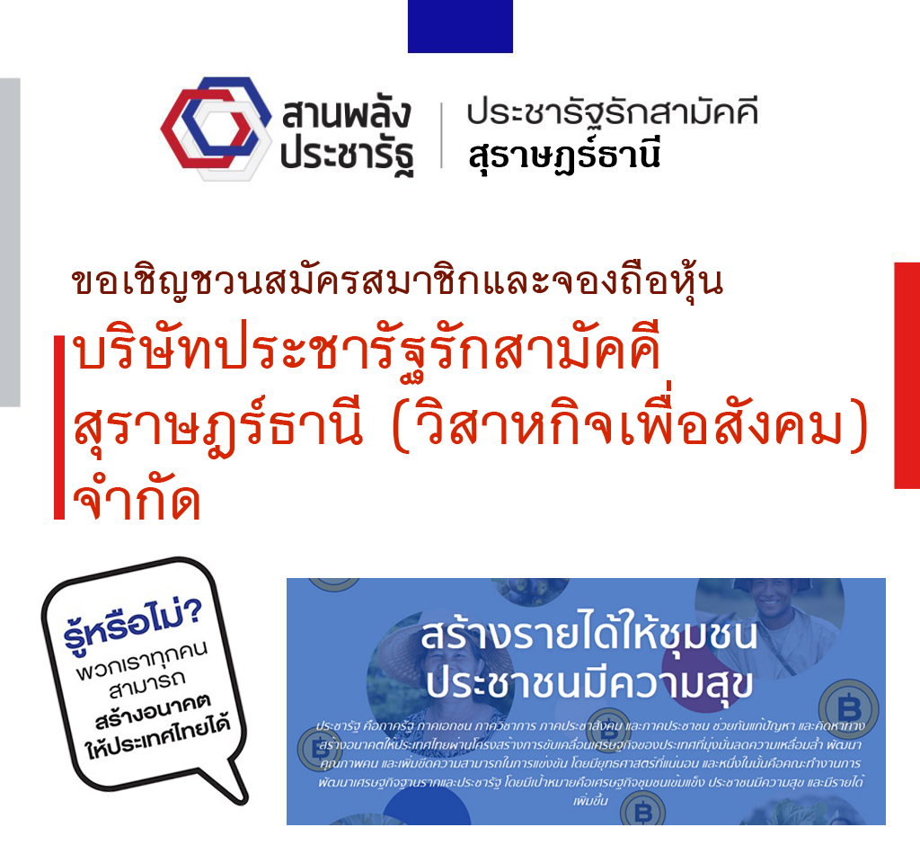 ขอเชิญชวนสมัครสมาชิกและจองถือหุ้นบริษัทประชารัฐรักสามัคคีสุราษฎร์ธานี (วิสาหกิจเพื่อสังคม) จำกัด