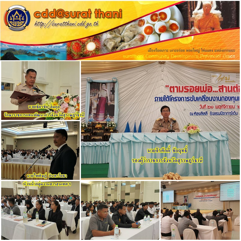 วันที่ 21 พฤศจิกายน 2559 นายจิรศักดิ์ ชัยฤทธิ์ รองผู้ว่าราชการจังหวัดสุราษฎร์ธานี เป็นประธานเปิดโครงการ“ตามรอยพ่อ สานต่อปณิธานแม่” ภายใต้โครงการขับเคลื่อนงานกองทุนแม่ของแผ่นดิน ปี 2560 กิจกรรมพัฒนาและเสริมสร้างกระบวนการมีส่วนร่วมเครือข่ายกองทุนแม่ของแผ่นดิน ณ โรงแรมนิภาการ์เด้น อำเภอเมืองสุราษฎร์ธานี โดยนายเธียรชัย ลิ่มกุล รักษาราชการแทนพัฒนาการจังหวัดสุราษฎร์ธานี กล่าวรายงาน และนายไพศิษฎ์ อินทรโยธา หัวหน้ากลุ่มงานสารสนเทศฯ กล่าวต้อนรับ ทั้งนี้ผู้เข้าร่วมประชุมชนประกอบด้วยผู้แทนหมู่บ้านกองทุนแม่ฯ เจ้าหน้าที่พัฒนาชุมชน และคณะกรรมการเครือข่ายกองทุนแม่ของแผ่นดิน รวมจำนวนทั้งสิ้น 313 คน
