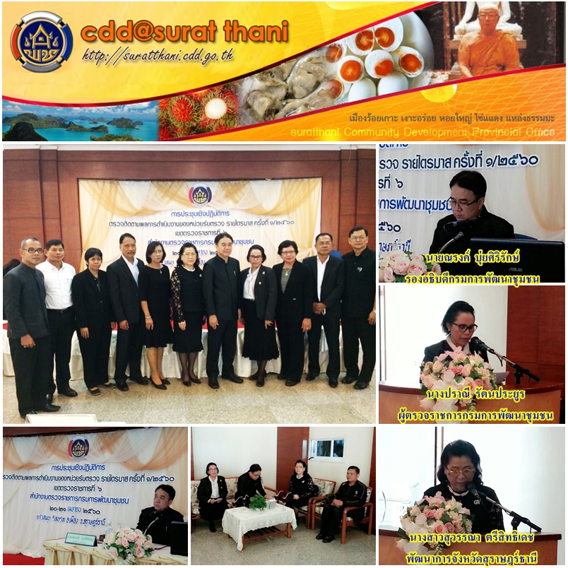 เมื่อวันที่20 เม.ย. 60 นายณรงค์ บุ่ยศิริรักษ์ รองอธิบดีกรมการพัฒนาชุมชน เดินทางมามอบนโยบายการดำเนินงานตามยุทธศาสตร์กรมการพัฒนาชุมชน ในการประชุมเชิงปฏิบัติการตรวจติดตามผลการดำเนินงานของหน่วยรับตรวจรายไตรมาส ครั้งที่ 1/2560 เขตตรวจราชการที่ 6 สำนักงานตรวจราชการกรมการพัฒนาชุมชน โดย นางปราณี รัตนประยูร ผู้ตรวจราชการกรมการพัฒนาชุมชน เขตตรวจที่ 6 และ 8 เป็นผู้กล่าวรายงานการจัดประชุมฯ และ นางสาวสุวรรณา ตรีสิทธิเดช พัฒนาการจังหวัดสุราษฎร์ธานี กล่าวต้อนรับ ซึ่งผู้เข้าร่วมรับมอบนโยบายประกอบด้วย พัฒนาการจังหวัด/พัฒนาการอำเภอ/หัวหน้ากลุ่มงาน และผู้มีส่วนเกี่ยวข้อง ของเขตตรวจราชการที่ 6 (ชุมพร พัทลุง นครศรีธรรมราช สุราษฎร์ธานี) ระหว่างวันที่ 20-21 เมษายน 2560 ณ โรงแรมแก้วสมุยรีสอร์ท อำเภอเมืองสุราษฎร์ธานี