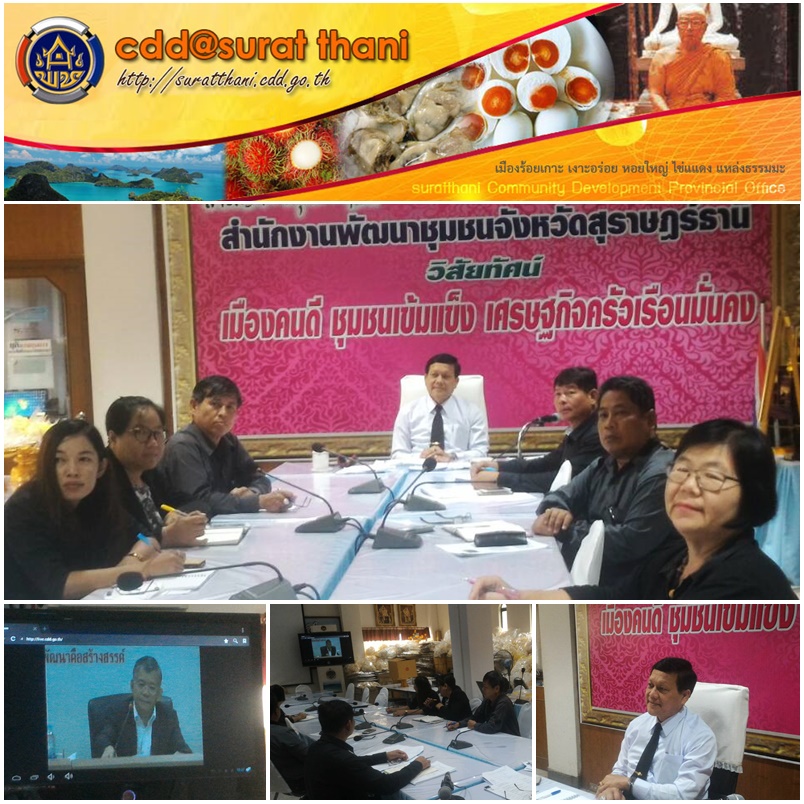 วันที่ 5 ตุลาคม 2560 เวลา 09.30 น. นายวาทกานต์ ช่อแก้ว พัฒนาการจังหวัดสุราษฎร์ธานี พร้อมด้วยหัวหน้ากลุ่มงาน/ฝ่าย และนักวิชาการพัฒนาชุมชนจังหวัด ร่วมรับฟังการประชุมทางไกล VDO conference การประชุมกรมการพัฒนาชุมชน ครั้งที่ 9/2560 โดยมีนายอภิชาติ โตดิลกเวชช์ อธิบดีกรมการพัฒนาชุมชน เป็นประธานพร้อมมอบนโยบายในการปฏิบัติงาน นโยบายการขับเคลื่อนยุทธศาสตร์กรมการพัฒนาชุมชน ประจำปีงบประมาณ 2561 ณ ห้องประชุมสำนักงานพัฒนาชุมชนจังหวัดสุราษฎร์ธานี