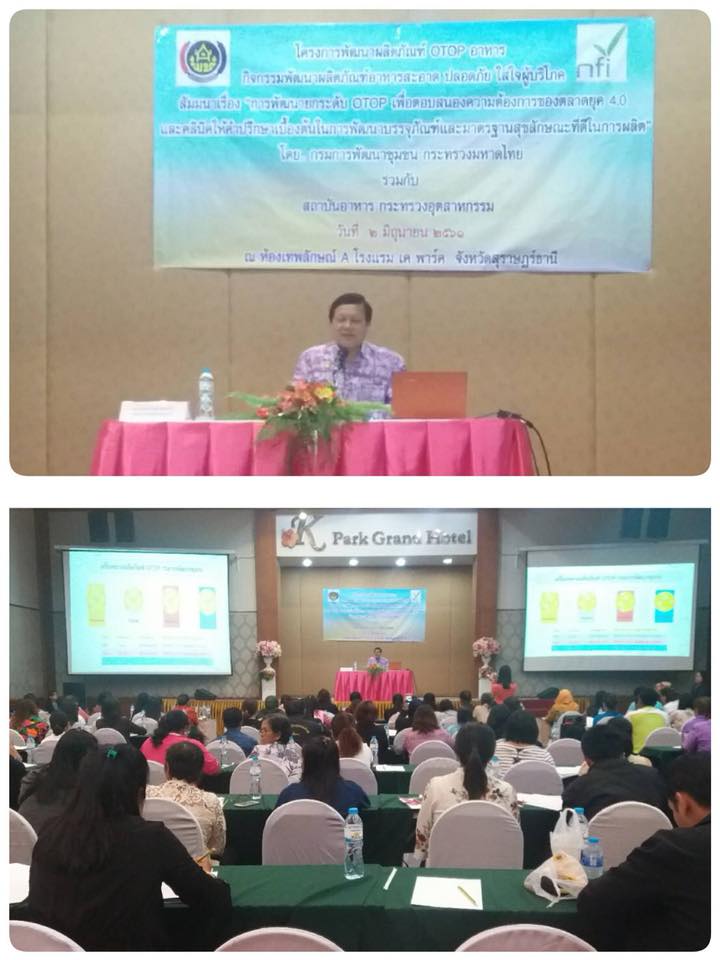 นายวาทกานต์ ช่อแก้ว พัฒนาการจังหวัดสุราษฎร์ธานี เป็นประธานเปิดอบรมโครงการพัฒนาผลิตภัณฑ์ OTOP อาหารปลอดภัยใส่ใจผู้บริโภค 4 จังหวัดภาคใต้ (ชุมพร พังงา นครศรีธรรมราช สุราษฎร์ธานี) ณ โรงแรมเคปาร์ค สุราษฎร์ธานี