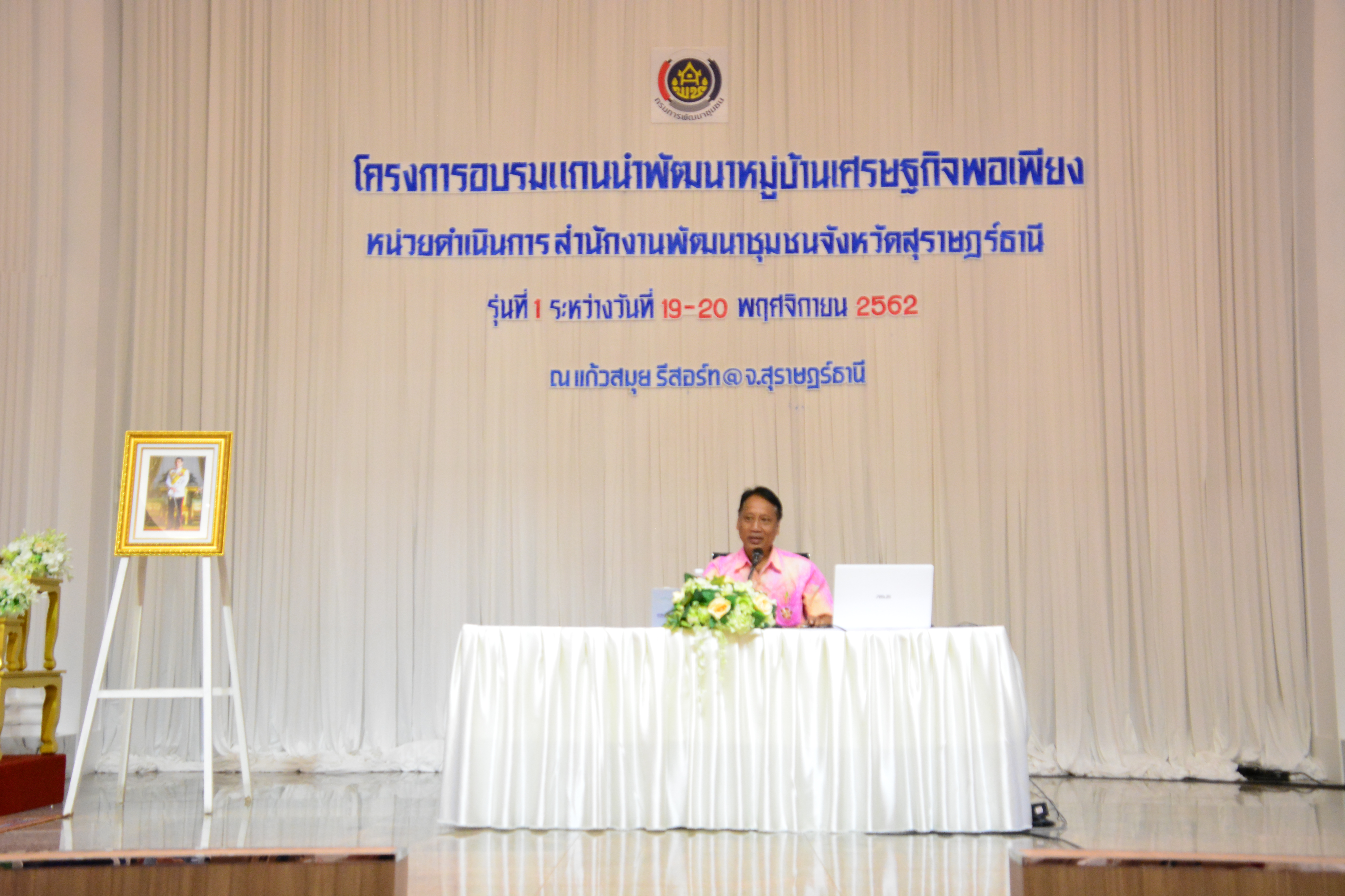 นายไพศิษฏ์ อินทรโยธา หัวหน้ากลุ่มงานส่งเสริมการพัฒนาชุมชน รักษาราชการแทนพัฒนาการจังหวัดสุราษฎร์ธานี ประธานเปิดการประชุมโครงการอบรมแกนนำพัฒนาหมู่บ้านเศรษฐกิจพอเพียง รุ่นที่ 1 ระหว่างวันที่ 19 – 20 พฤศจิกายน 2562 ณ ห้องสมใจหมาย โรงแรมแก้วสมุย รีสอร์ท โดยกลุ่มเป้าหมาย จาก 10 อำเภอ 85 หมู่บ้าน 180 คน เข้าร่วมประชุมเพื่อขับเคลื่อนกิจกรรมดังกล่าว
