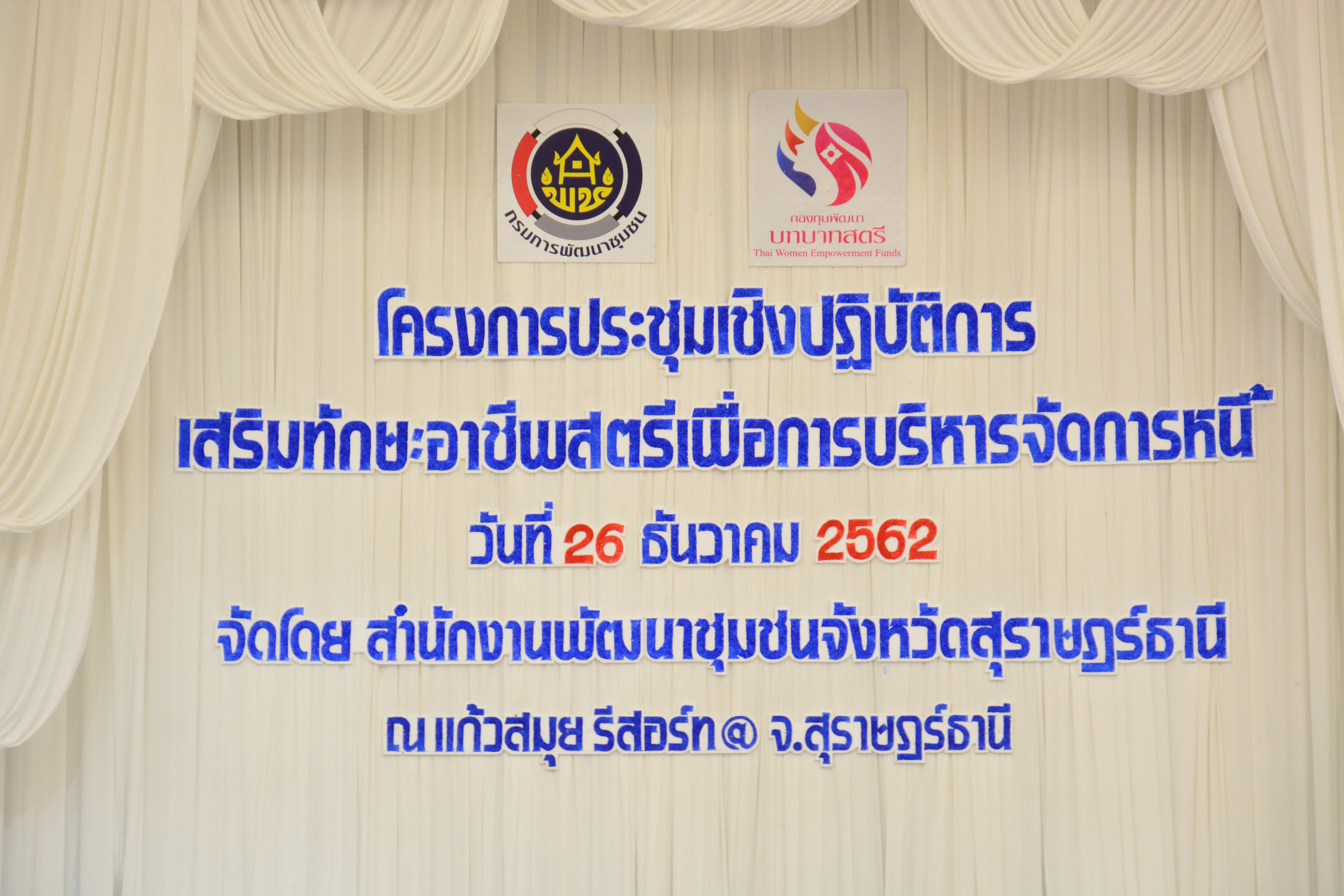 นายไพศิษฏ์ อินทรโยธา รักษาราชการเเทนพัฒนาการจังหวัดสุราษฎร์ธานี เป็นประธานเปิดประชุมเชิงปฏิบัติการเสริมทักษะอาชีพสตรี เพื่อการบริหารจัดการหนี้ โดยมีกลุ่มเป้าหมาย จำนวน 155 คน โดยมีนายนิรันดร์ จินดานาค ผู้บริหารสำนักงานอธิการบดี มหาวิทยาลัยวลัยลักษณ์ เป็นวิทยากรบรรยาย เพื่อให้สตรีมีทักษะในการประกอบอาชีพมากขึ้น ณ โรงเเรมเเก้วสมุยรีสอร์ท
