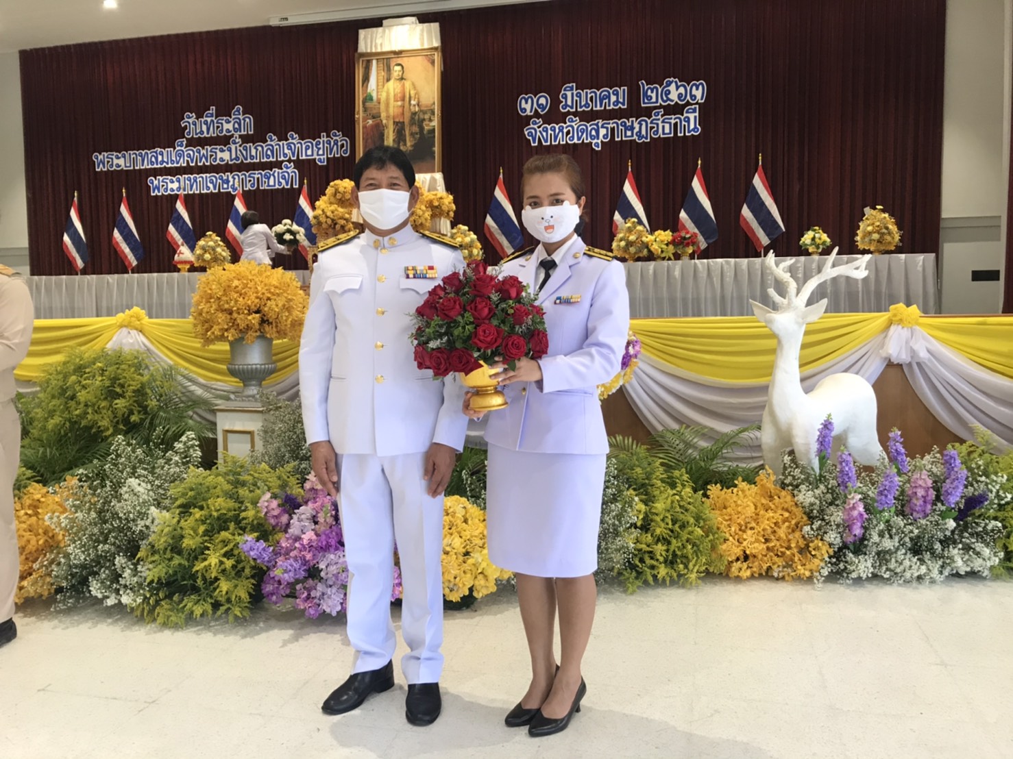 -วันอังคาร ที่ 31 มีนาคม 2563 เวลา 08.30 น. นายวิชวุทย์ จินโต ผู้ว่าราชการจังหวัดสุราษฎร์ธานี ประธานการจัดงานรัฐพิธีถวายราชสักการะถวายเป็นพระราชกุศลเพื่อน้อมรำลึกถึงสมเด็จพระบูรพมหากษัตริยาธิราช “วันที่ระลึกพระบาทสมเด็จพระนั่งเกล้าเจ้าอยู่หัว พระมหาเจษฎาราชเจ้า” พร้อมด้วยหัวหน้าส่วนราชการ นายอำเภอ ตัวแทนส่วนราชการ ร่วมวางพานพุ่มดอกไม้ ณ อาคารศูนย์กลางการประชุมภาคใต้ตอนบน ศาลากลางจังหวัดสุราษฎร์ธานี
