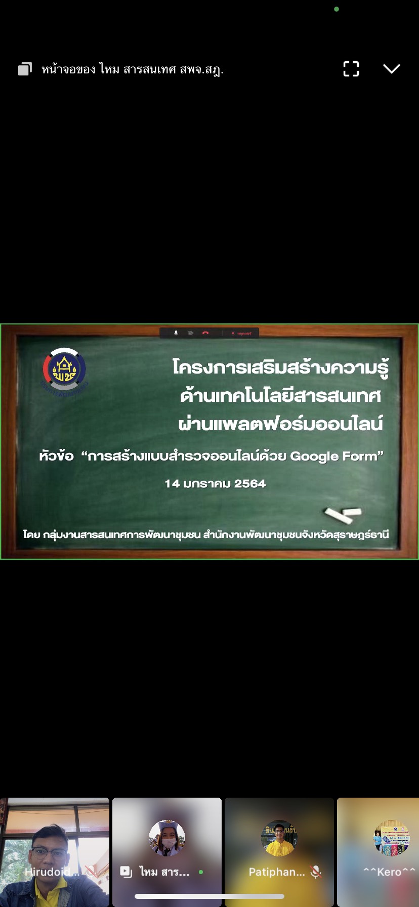 สำนักงานพัฒนาชุมชนจังหวัดสุราษฎร์ธานี เดินหน้าเสริมสร้างความรู้ด้านเทคโนโลยีผ่านแพลตฟอร์มออนไลน์ แก่เจ้าหน้าที่พัฒนาชุมชน ในสถานการณ์การแพร่ระบาดของโรคไวรัสโคโรน่า 19