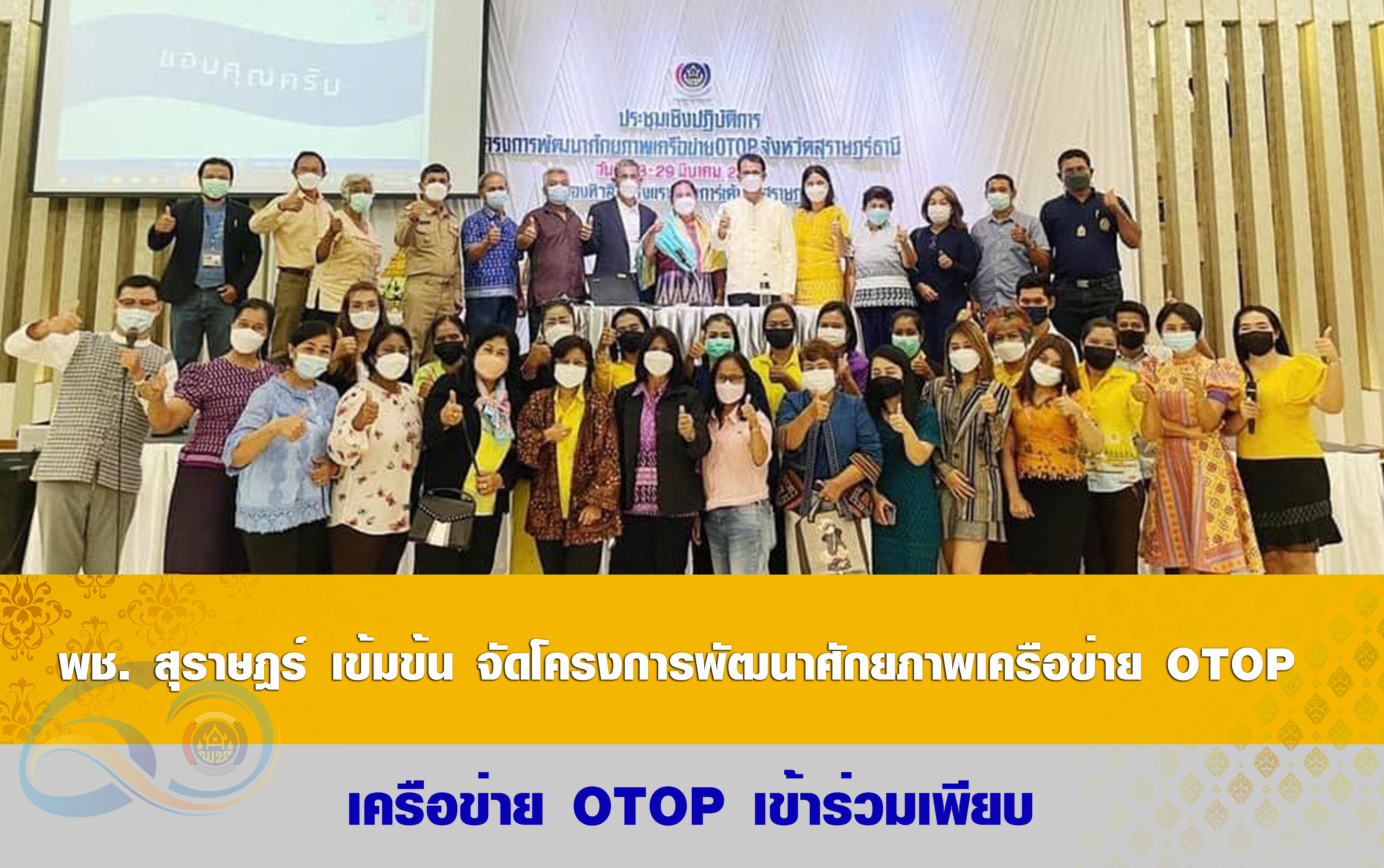 นายกรองศักดิ์ โอยสวัสดิ์ พัฒนาการจังหวัดสุราษฎร์ธานี มอบหมายให้ นายพิชัย มณีลาภ ผู้อำนวยการกลุ่มงานส่งเสริมการพัฒนาชุมชน เป็นผู้ชี้แจงวัตถุประสงค์ของโครงการพร้อมด้วย เจ้าหน้าที่พัฒนาชุมชนจังหวัดสุราษฎร์ธานี และนักการตลาดรุ่นใหม่ ดำเนินการจัดประชุมเชิงปฏิบัติการพัฒนาศักยภาพเครือข่าย OTOP ตามโครงการพัฒนาศักยภาพเครือข่าย OTOP โดยมีเครือข่าย OTOP อำเภอ และเจ้าหน้าที่ที่รับผิดชอบงาน OTOP เข้าร่วมโครงการจำนวน 40 ราย กำหนดดำเนินการระหว่างวันที่ 28-29 มีนาคม 2565 ณ ห้องทิวลิป 1 โรงแรมนิภา การ์เด้น อ.เมือง จ.สุราษฎร์ธานี