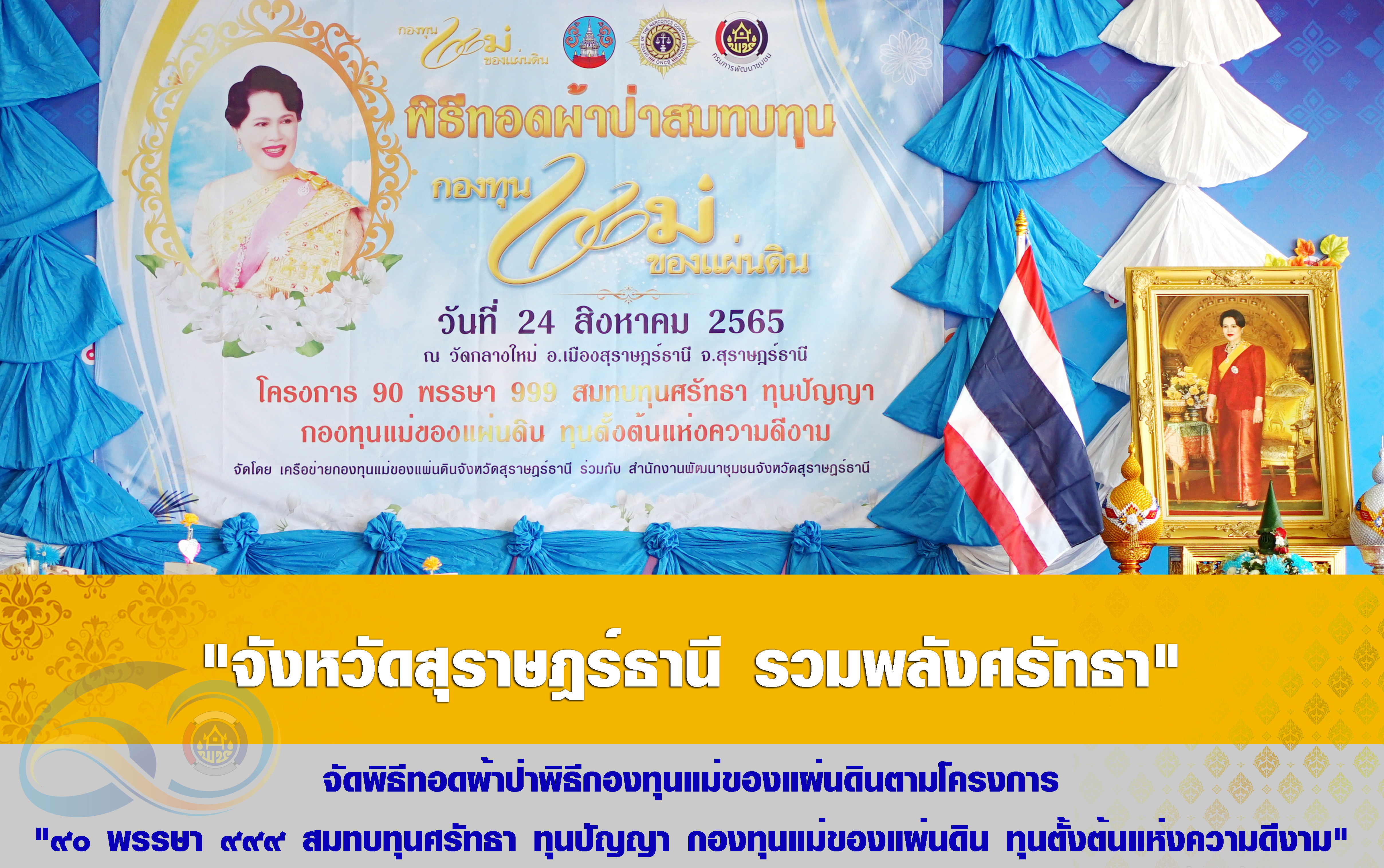 โดยมอบหมายให้สำนักงานพัฒนาชุมชนจังหวัดสุราษฎร์ธานี ร่วมกับคณะกรรมการเครือข่ายกองทุนแม่ของแผ่นดินจังหวัดสุราษฎร์ธานี จัดให้มีการทอดผ้าป่ากองทุนแม่ของแผ่นดิน ตามโครงการ “๙๐ พรรษา ๙๙๙ สมทบทุนศรัทธา ทุนปัญญา กองทุน แม่ของแผ่นดิน ทุนตั้งต้นแห่งความดีงาม” เพื่อให้สมาชิกกองทุนแม่ของแผ่นดินจังหวัดสุราษฎร์ธานี จำนวน ๔๑๓ กองทุน ประชาชน และผู้มีจิตศรัทธา ได้ร่วมสมทบกองทุนไม่น้อยกว่ากองทุนละ ๙๙๙ บาท สำหรับการดำเนินกิจกรรมป้องกันแก้ไขปัญหายาเสพติด และปัญหาอื่นๆ ภายในหมู่บ้าน