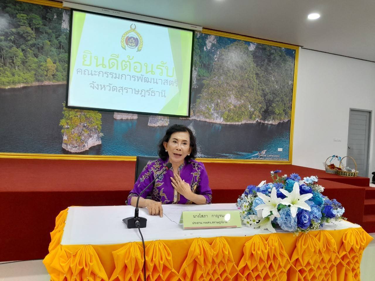 นางโสภา กาญจนะ ประธานคณะกรรมการพัฒนาสตรีจังหวัดสุราษฎร์ธานี (กพสจ.) เป็นประธานการประชุมประจำเดือนพฤศจิกายน ๒๕๖๕ คณะกรรมการพัฒนาสตรีจังหวัดสุราษฎร์ธานี (สัญจรครั้งที่ ๖) ณ ห้องประชุมเทศบาลตำบลบ้านเชี่ยวหลาน ตำบลเขาพัง อำเภอบ้านตาขุน จังหวัดสุราษฎร์ธานี โดยมีกรรมการพัฒนาสตรีจังหวัดฯ จำนวน ๕๘ คน ซึ่งประธานฯได้ดำเนินการประชุม ตามระเบียบวาระฯ และสรุปการประชุมดังนี้