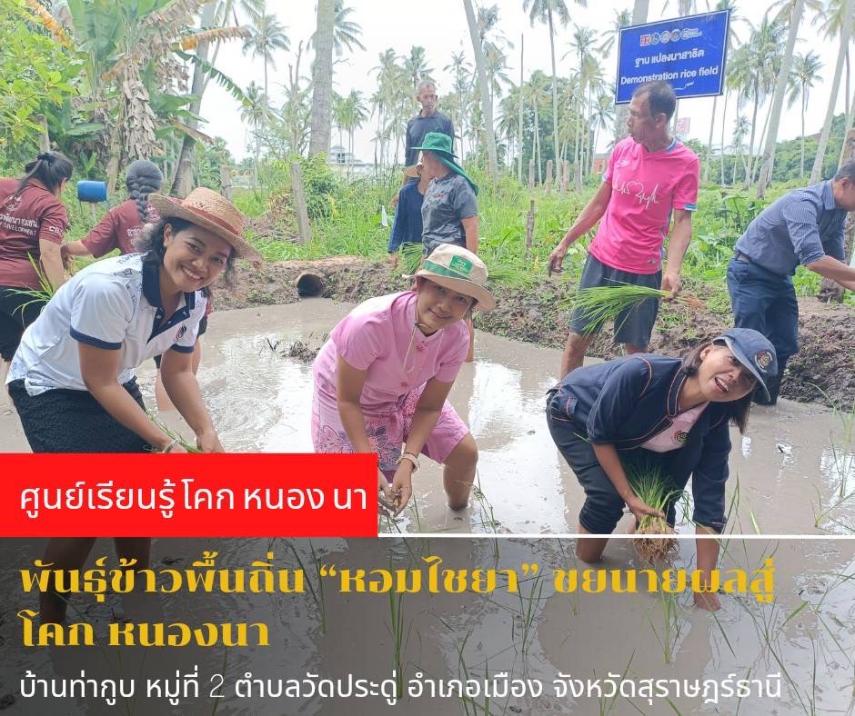 นายประโมทย์ ดำจวนลม พัฒนาการจังหวัดสุราษฎร์ธานี มอบหมายให้นางสาวสุกัญญา พรหมสกุล นักวิชาการพัฒนาชุมชนชำนาญการ และนางสาวปัญญพร เพชรศรี นักวิชาการพัฒนาชุมชนชำนาญการ ร่วมกิจกรรมดำนาปลูกข้าวพื้นถิ่นข้าวหอมไชยา ณ บ้านท่ากูบ หมู่ที่ 2 ตำบลวัดประดู่ อำเภอเมืองสุราษฎร์ธานี จังหวัดสุราษฎร์ธานี โดยการดำเนินกิจกรรมดำนา ปลูกข้าวพื้นถิ่นข้าวหอมไชยา ครั้งนี้ได้รับสนับสนุนพันธุ์ข้าวพื้นถิ่น “หอมไชยา”จากนายพูลศักดิ์ สาระคง ประธานกลุ่มวิสาหกิจชุมชนอนุรักษ์พันธุ์ข้าวหอมไชยา ตำบลโมถ่าย อำเภอไชยา จังหวัดสุราษฎร์ธานี เป็นกลุ่มเป็นแปลงนาการอนุรักษ์พันธุ์ข้าว ตามโครงการอนุรักษ์พันธุกรรมพืชอันเนื่องมาจากพระราชดำริ เพื่อสืบสานพันธุ์ข้าวหอมไชยา ตามหลักปรัชญาเศรษฐกิจพอเพียง