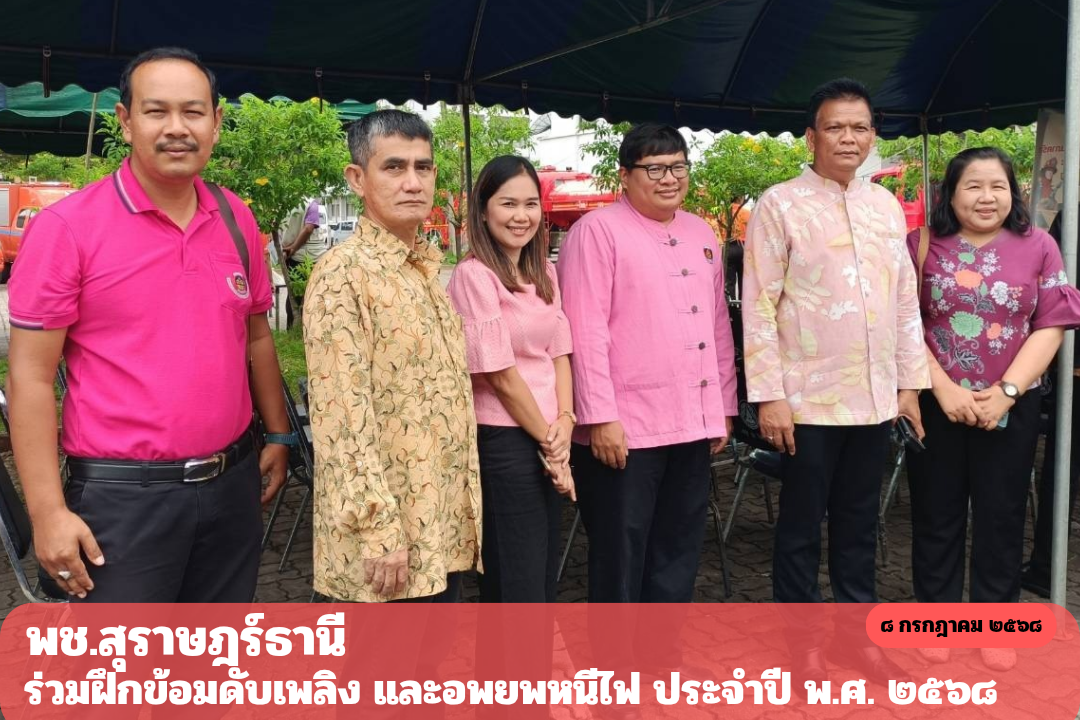 ในสถานประกอบกิจการและหน่วยงานภาครัฐ จังหวัดสุราษฎร์ธานี ได้กำหนดการฝึกข้อมดับเพลิงและอพยพหนีไฟ ประจำปี พ.ศ. ๒๕๖๘ ณ ศูนย์ราชการจังหวัดสุราษฎร์ธานี ในวันที่ ๘ กรกฎาคม ๒๕๖๘ เวลา ๐๘.๓๐ – ๑๖.๐๐ น. เพื่อเป็นการเตียมความพร้อมและลดความเสี่ยงการเกิดอัคคีภัยของศูนย์ราชการจังหวัดสุราษฎร์ธานี ภายโต้โครงการมหาดไทย แรงงาน สานพลังเครือข่าย ร่วมใจต้านอัคคีภัยในสถานประกอบกิจการ