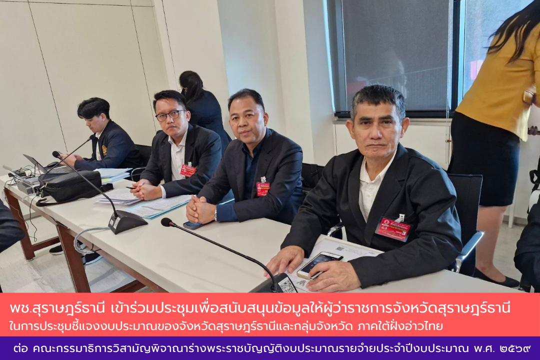นายประโมทย์ ดำจวนลม พัฒนาการจังหวัดสุราษฎร์ธานี มอบหมายนายพิพัฒน์ กองพล ผู้อำนวยการกลุ่มงานยุทธศาสตร์การพัฒนาชุมชน เข้าร่วมประชุมเพื่อสนับสนุนข้อมูลให้ผู้ว่าราชการจังหวัดสุราษฎร์ธานี ในการประชุมชี้แจงงบประมาณของจังหวัดสุราษฎร์ธานีและกลุ่มจังหวัด ภาคใต้ฝั่งอ่าวไทย