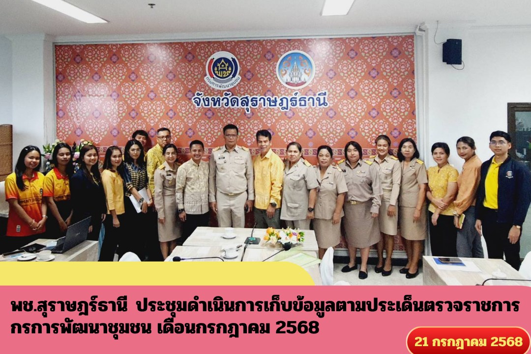 🚩นายประโมทย์ ดำจวนลม พัฒนาการจังหวัดสุราษฎร์ธานี ร่วมต้อนรับว่าที่ ร.ต.สมโชค จักร์หรัด นักวิชาการพัฒนาชุมชนชำนาญการพิเศษ ผู้อำนวยการกลุ่มงานตรวจราชการ นายศุภฤกษ์ หิรัญสาลี นักทรัพยากรบุคคลชำนาญการ และคณะกลุ่มงานตรวจราชการ ศูนย์ศึกษาและพัฒนาชุมชนนครศรีธรรมราช ในการประชุมดำเนินการเก็บข้อมูลตามประเด็นตรวจราชการกรการพัฒนาชุมชน เดือนกรกฎาคม 2568 เพื่อเก็บข้อมูลตามประเด็นตรวจราชการเดือนกรกฎาคม 2568 ณ ห้องประชุมสำนักงานพัฒนาชุมชนจังหวัดสุราษฎร์ธานี ชั้น 4 ศาลากลางจังหวัดสุราษฎร์ธานี ต่อมาในช่วงบ่าย นายนายพิชัย มณีลาภ ผู้อำนวยการกลุ่มงานส่งเสริมการพัฒนาชุมชน พร้อมด้วย นางสาวภาวิณี เจนุโร นักวิชาการพัฒนาชุมชนชำนาญการ นางสาวสุกัญญา พรหมสกุล นักวิชาการพัฒนาชุมชนชำนาญการ นางสาวบุปผชาติ พลายแก้ว นักวิชาการพัฒนาชุมชนชำนาญการ และนางสาวเจิดนภา รัชดาชาน นักวิชาการพัฒนาชุมชนชำนาญการ นำคณะกลุ่มงานตรวจราชการฯ ลงพื้นที่ศูนย์เรียนรู้โคก หนอง นา แปลงนายอนันต์ เจริญมี หมู่ที่ 3 ตำบลเขาหัวควาย อำเภอพุนพิน จังหวัดสุราษฎร์ธานี เพื่อจัดเก็บข้อมูลภารกิจงานกรมการพันาชุมชน อาทิ โคก หนอง นา ข้อมูลการแปรรูปผลิตภัณฑ์จากแปลงโคกฯ ฐานข้อมูกอทุนชุมชน ฐานข้อมูลหมู่บ้านเศรษฐิจพอเพียง ฐานข้อมูลชุมชนท่องเที่ยวภายใต้โครงการต่างๆ ของกรม ฐานข้อมูลผู้ประกอบการและผลิตภัณฑ์ OTOP เป็นต้น