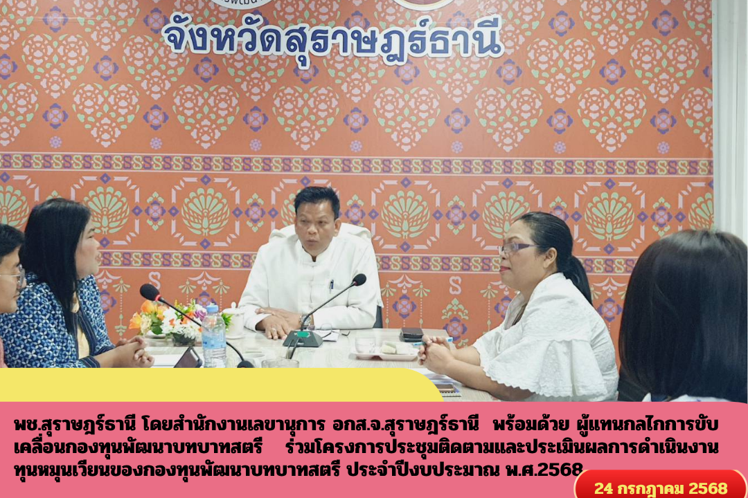 พช.สุราษฎร์ธานี โดยสำนักงานเลขานุการ อกส.จ.สุราษฎร์ธานี พร้อมด้วย ผู้แทนกลไกการขับเคลื่อนกองทุนพัฒนาบทบาทสตรี ร่วมโครงการประชุมติดตามและประเมินผลการดำเนินงานทุนหมุนเวียนของกองทุนพัฒนาบทบาทสตรี ประจำปีงบประมาณ พ.ศ.2568