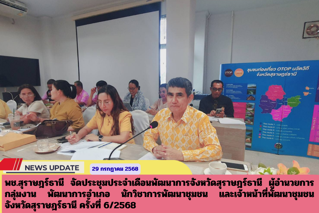 นายประโมทย์ ดำจวนลม พัฒนาการจังหวัดสุราษฎร์ธานี มอบหมายนายพิพัฒน์ กองพล ผู้อำนวยการกลุ่มงานยุทธศาสตร์การพัฒนาชุมชน เป็นประธานการประชุมประจำเดือนพัฒนาการจังหวัดสุราษฎร์ธานี ผู้อำนวยการกลุ่มงานพัฒนาการอำเภอ นักวิชาการพัฒนาชุมชน และเจ้าหน้าที่พัฒนาชุมชนจังหวัดสุราษฎร์ธานี ครั้งที่ 6/2568 ณ ห้องประชุมสำนักงานพัฒนาชุมชนจังหวัดสุราษฎร์ธานี โดยมีสาระสำคัญ ดังนี้