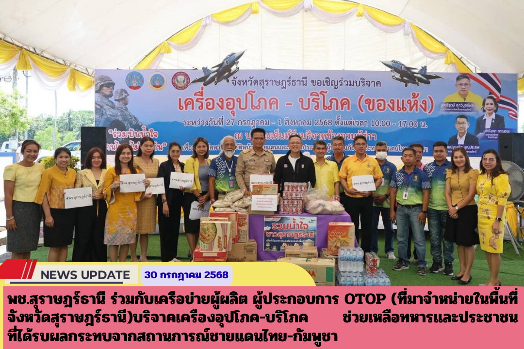 จังหวัดสุราษฎร์ธานี ร่วมกับองค์การบริหารส่วนจังหวัดสุราษฎร์ธานี เทศบาลนครสุราษฎร์ธานี และหน่วยงานต่างๆ ทั้งภาครัฐ และเอกชน จัดกิจกรรมรับบริจาคเครื่องอุปโภค-บริโภค (อาหารแห้ง) เพื่อนำไปอบให้ทหารที่ปฏิบัติหน้าที่บริเวณชายแดและประชาชนที่ได้รับผลกระทบจากสถานการณ์ชายแดนไทย-กัมพูชา ใ พื้นที่จังหวัดสุรินทร์และจังหวัดที่ติดชายแดนประเทศกัมพูชา โดยมีกำหนดรับบริจาค ระหว่างวันที่ 27 กรกฎาคม ถึงวันที่ 1 สิงหาคม 568 ณ บริเวณจวนผู้ว่าราชการจังหวัดสุราษฎร์ธานี อำเภอเมืองฯ จังหวัดสุราษฎร์ธานี ซึ่งมีหน่วยงานต่างๆ และประชาชนทั่งไปได้นำสิ่งของมาร่วมบริจาคกันเป็นจำนวนมาก