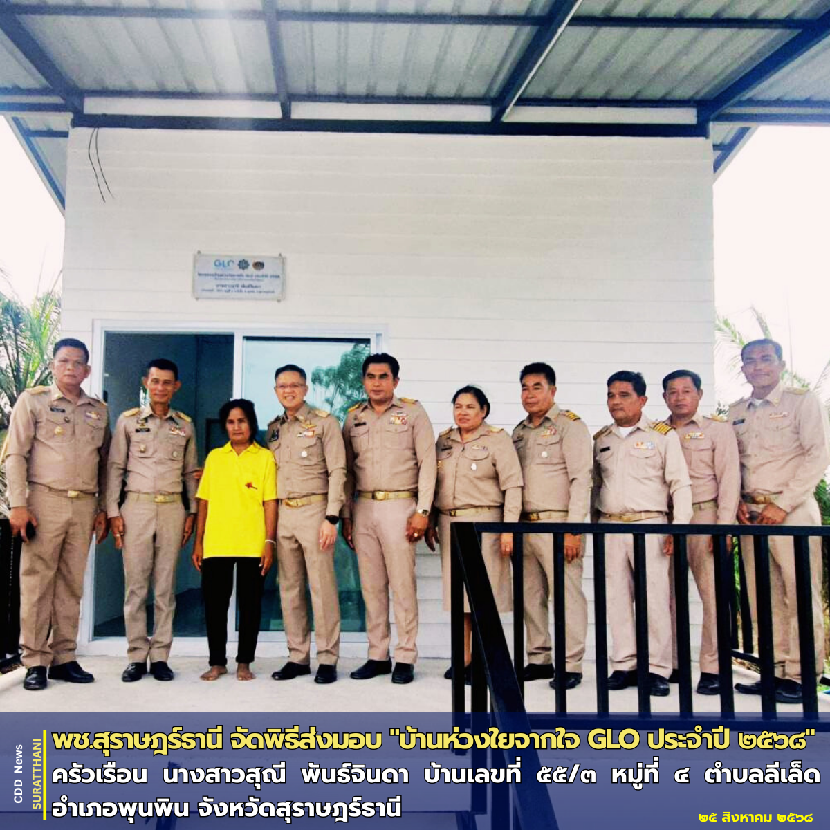 🚩นายประโมทย์ ดำจวนลม พัฒนาการจังหวัดสุราษฎร์ธานี นำทีม พช.สุราษฎร์ธานี จัดพิธีมอบบ้านครัวเรือนยากจน ตามโครงการบ้านห่วงใย จากใจ GLO ประจำปี ๒๕๖๘ โดย นายธีรุตม์ ศุภวิบูลย์ผล ผู้ว่าราชการจังหวัดสุราษฎร์ธานี ให้เกียรติ มาเป็นประธานในพิธีมอบบ้านครัวเรือนยากจน ตามโครงการบ้านห่วงใย จากใจ GLO ประจำปี ๒๕๖๘