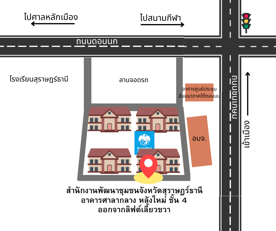 สำนักงานพัฒนาชุมชนจังหวัดสุราษฎร์ธานี ศาลากลางจังหวัดสุราษฎร์ธานี ชั้น 4 ตึกใหม่ ถนนดอนนก ตำบลมะขามเตี้ย อำเภอเมือง จังหวัดสุราษฎร์ธานี