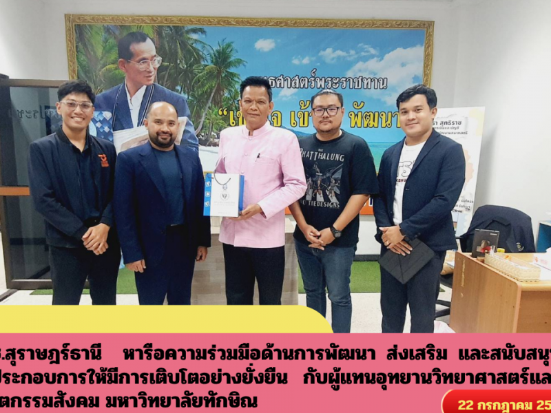 พช.สุราษฎร์ธานี หารือความร่วมมือด้านการพัฒนา ส่งเสริม และสนับสนุนผู้ประกอบการให้มีการเติบโตอย่างยั่งยืน กับผู้แทนอุทยานวิทยาศาสตร์และนวัตกรรมสังคม มหาวิทยาลัยทักษิณ