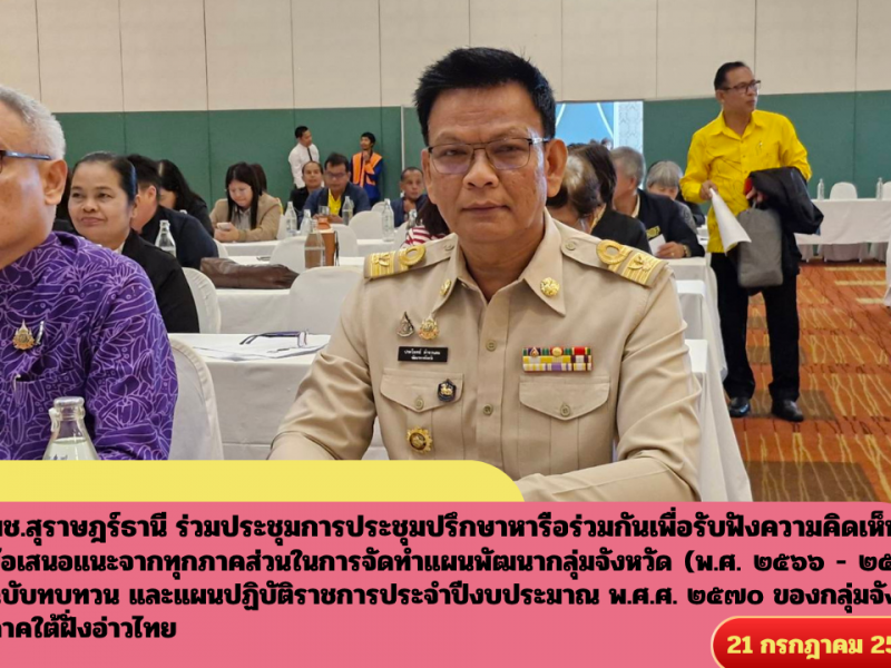 พช.สุราษฎร์ธานี ร่วมประชุมการประชุมปรึกษาหารือร่วมกันเพื่อรับฟังความคิดเห็น ข้อเสนอแนะจากทุกภาคส่วนในการจัดทำแผนพัฒนากลุ่มจังหวัด (พ.ศ. ๒๕๖๖ – ๒๕๗๐) ฉบับทบทวน และแผนปฏิบัติราชการประจำปีงบประมาณ พ.ศ.ศ. ๒๕๗๐ ของกลุ่มจังหวัดภาคใต้ฝั่งอ่าวไทย