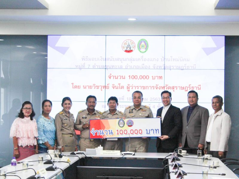 นายวิชวุทย์ จินโต ผู้ว่าราชการจังหวัดสุราษฎร์ธานี มอบเงินสนับสนุนกลุ่มวิสาหกิจชุมชนทำเครื่องแกงบ้านใหม่นิคม จำนวน 100,000 บาท