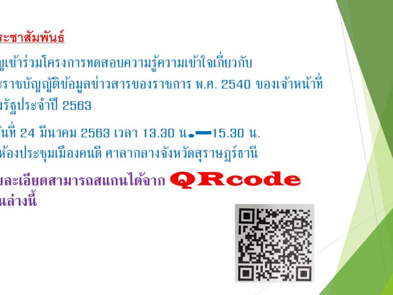 ประชาสัมพันธ์เชิญเข้าร่วมโครงการทดสอบความรู้ความเข้าใจเกี่ยวกับพระราชบัญญัติข้อมูลข่าวสารของทางราชการ พ.ศ. 2540 ของเจ้าหน้าที่ของรัฐ ประจำปี 2563